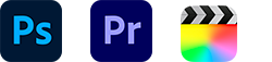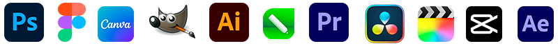 After Effects, Premiere Pro, Photoshop, Illustrator, Lightroom, CorelDRAW, InDesign, Figma, Sketch, Canva, DaVinci Resolve, Final Cut Pro, Sony Vegas, CapCut, Filmora e outros editores compatíveis.